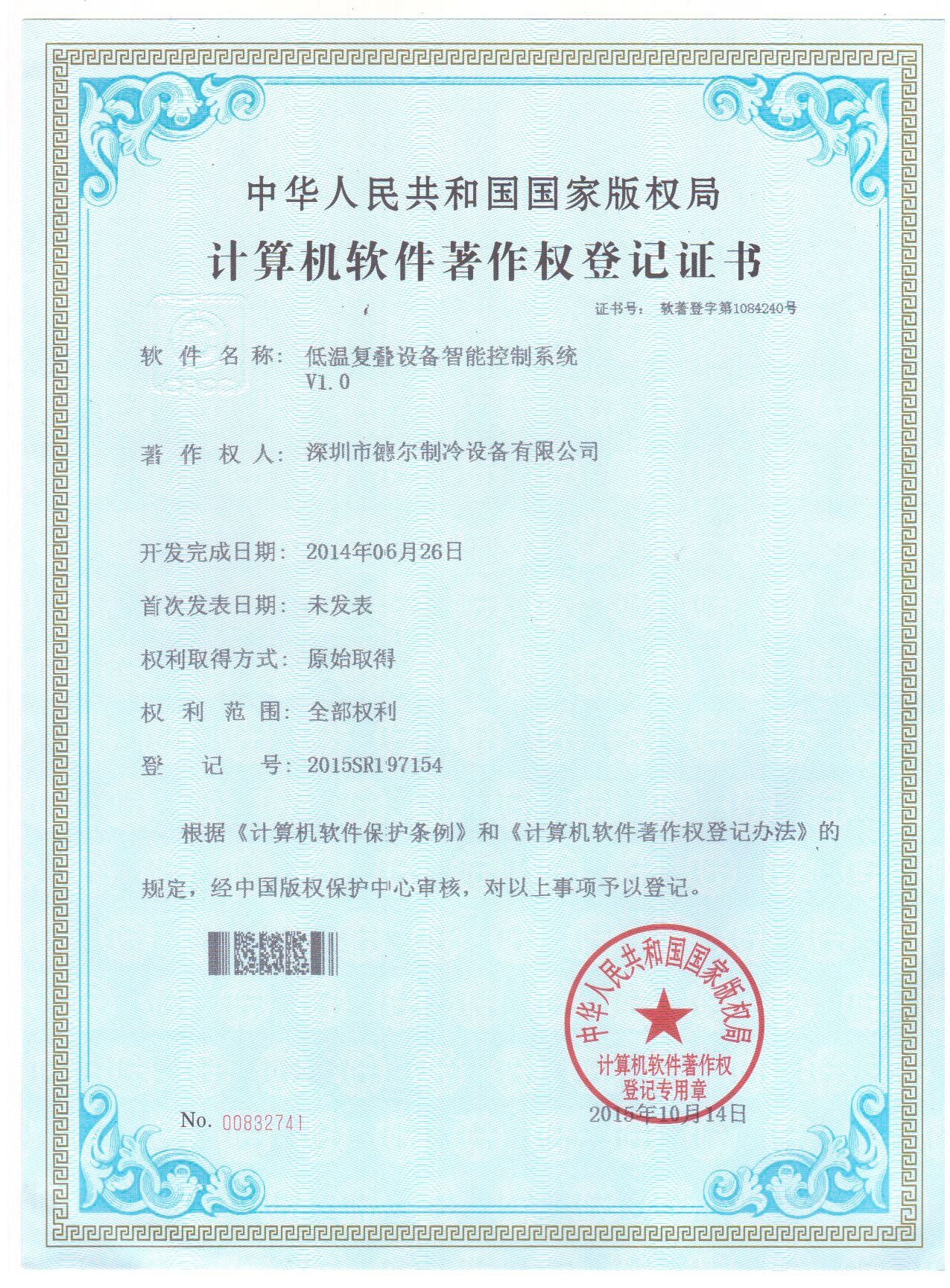 低溫復(fù)疊設(shè)備智能控制系統(tǒng) 軟件著作權(quán)登記證書