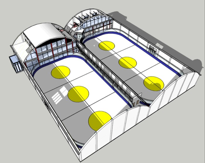 3A冰上空間有兩塊冰場(chǎng),大尺寸一點(diǎn)的是冰球場(chǎng),小尺寸一點(diǎn)的是花滑場(chǎng)。